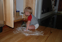 H has been in rare form lately. Here he is playing with corn starch. He was alone for about 4 minutes on Saturday and this is how I found him. A few minutes later while washing my hands, T yells, "Mom! Look what H is doing!" He was spreading diaper cream all over his body. Fantastic!